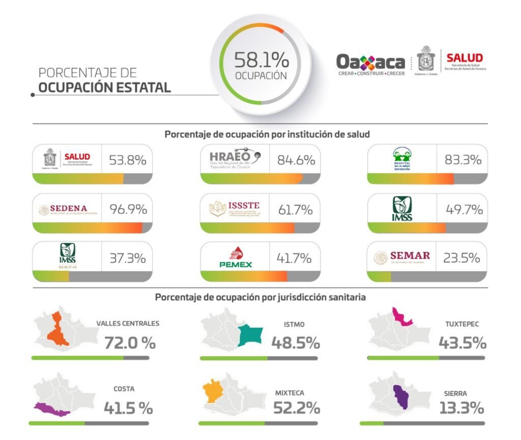 La ocupación hospitalaria total es del 58.1%, con un total de 15 hospitales al 100 % de su capacidad, la región con más ocupación es Valles Centrales con 72%, Mixteca con 52.2%, Istmo 48.5%, Tuxtepec con 43.5%, Costa 41.5% y Sierra 13.3%.