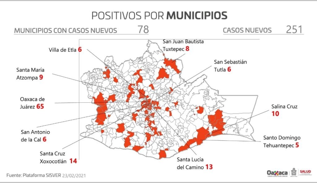 De los 251 casos nuevos registrados, estos afectan a 78 municipios, siendo el que mayor número de casos presenta el de Oaxaca de Juárez con 65, Santa Cruz Xoxocotlán 14, Santa Lucía del Camino 13, Salina Cruz 10, Santa María Atzompa nueve, San Juan Bautista Tuxtepec ocho, Villa de Etla, San Sebastián Tutla y San Antonio de la Cal seis cada uno; el resto cinco a un caso.