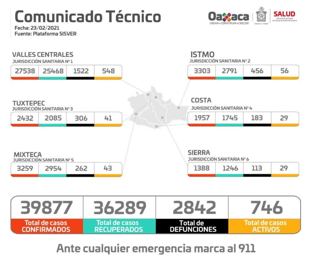 Durante el reporte, la jefa del Departamento de Urgencias Epidemiológicas y Desastres de los Servicios de Salud de Oaxaca (SSO), Argelia Julián Aquino, informó que se han notificado, 62 mil 410 casos,  de los cuales 17 mil 893 han sido negativos, hay cuatro mil 640 sospechosos, 36 mil 289 se han recuperado y 746 son casos activos.