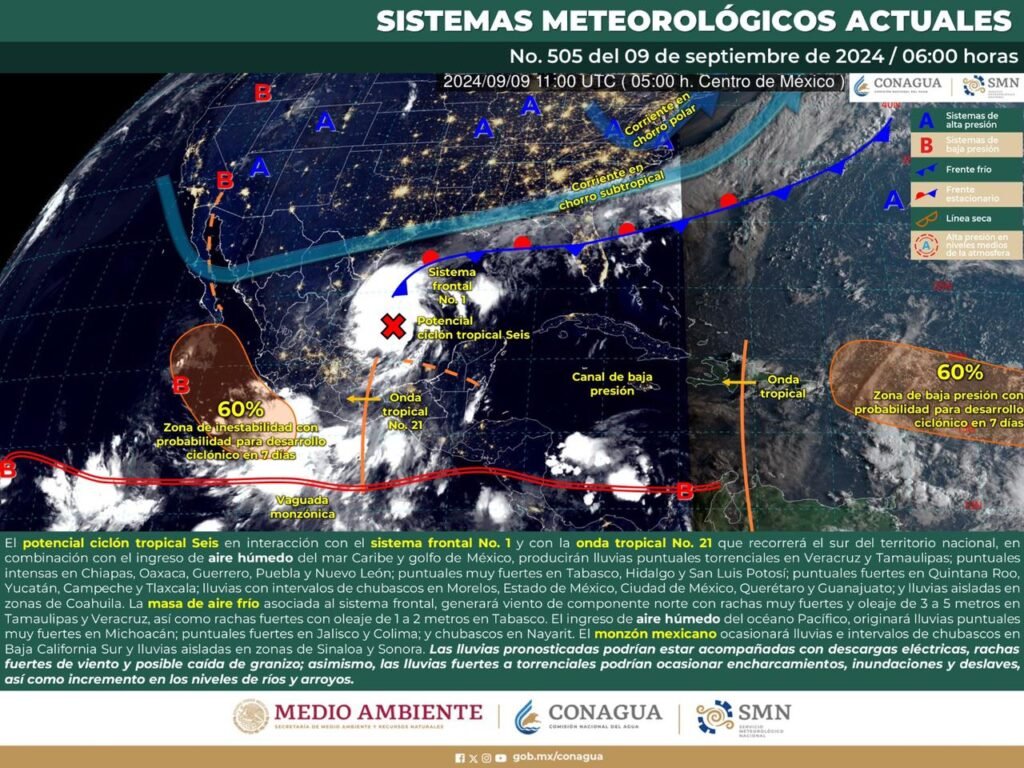 De acuerdo con el pronóstico de la Comisión Nacional del Agua (Conagua), el ciclón tropical seis se desplazará paralelo al Golfo de México, interactuando con la onda tropical número 21, el frente frío número 1 y una baja presión en el Pacífico. Esta interacción está generando un temporal lluvioso en la región, con acumulados significativos en las áreas de la Cuenca del Papaloapan, Istmo, Sierra de Juárez y Sierra de Flores Magón.