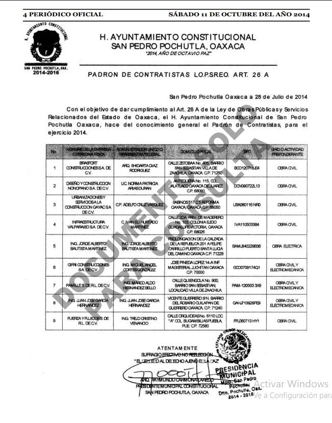 Periódico Oficial del Estado de Oaxaca. Edición Ordinaria No. 41, 11 de octubre de 2014. Padrón de contratistas de obra pública municipal.