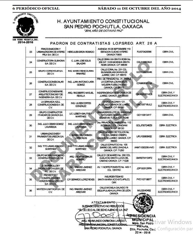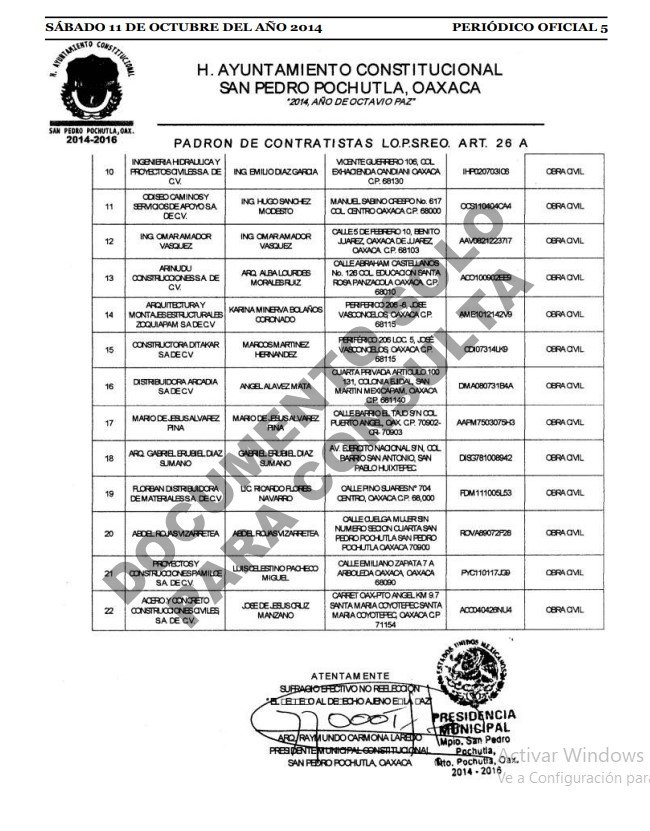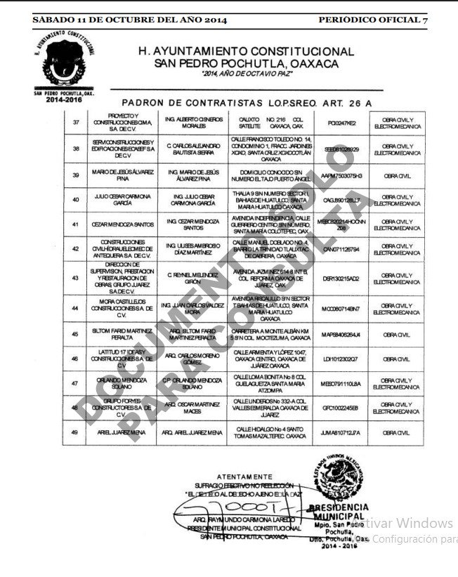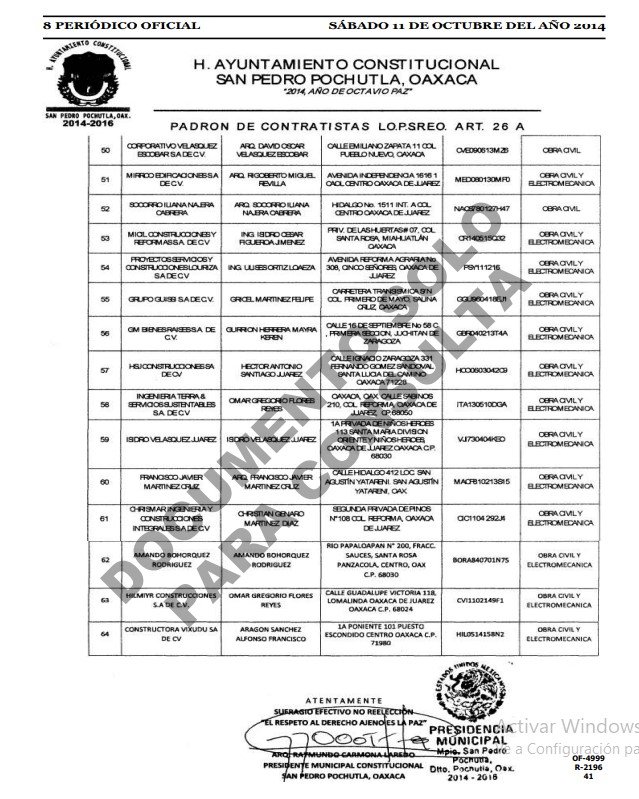 Periódico Oficial del Estado de Oaxaca. Edición Ordinaria No. 41, 11 de octubre de 2014. Padrón de contratistas de obra pública municipal.
