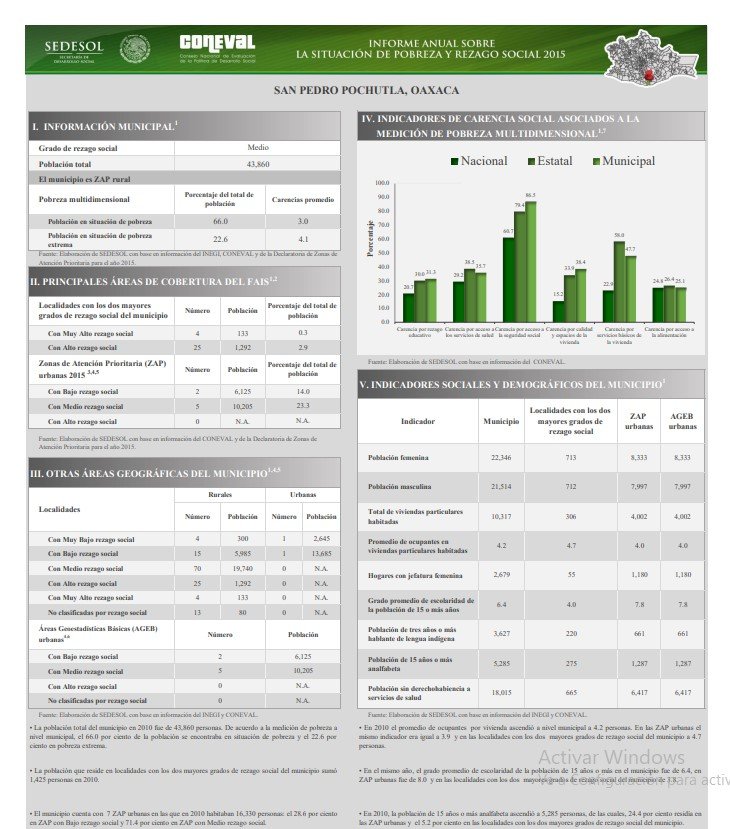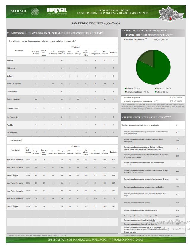El perfil municipal de San Pedro Pochutla, elaborado por SEDESOL, INEGI y CONEVAL, reporta que al cierre de 2015: