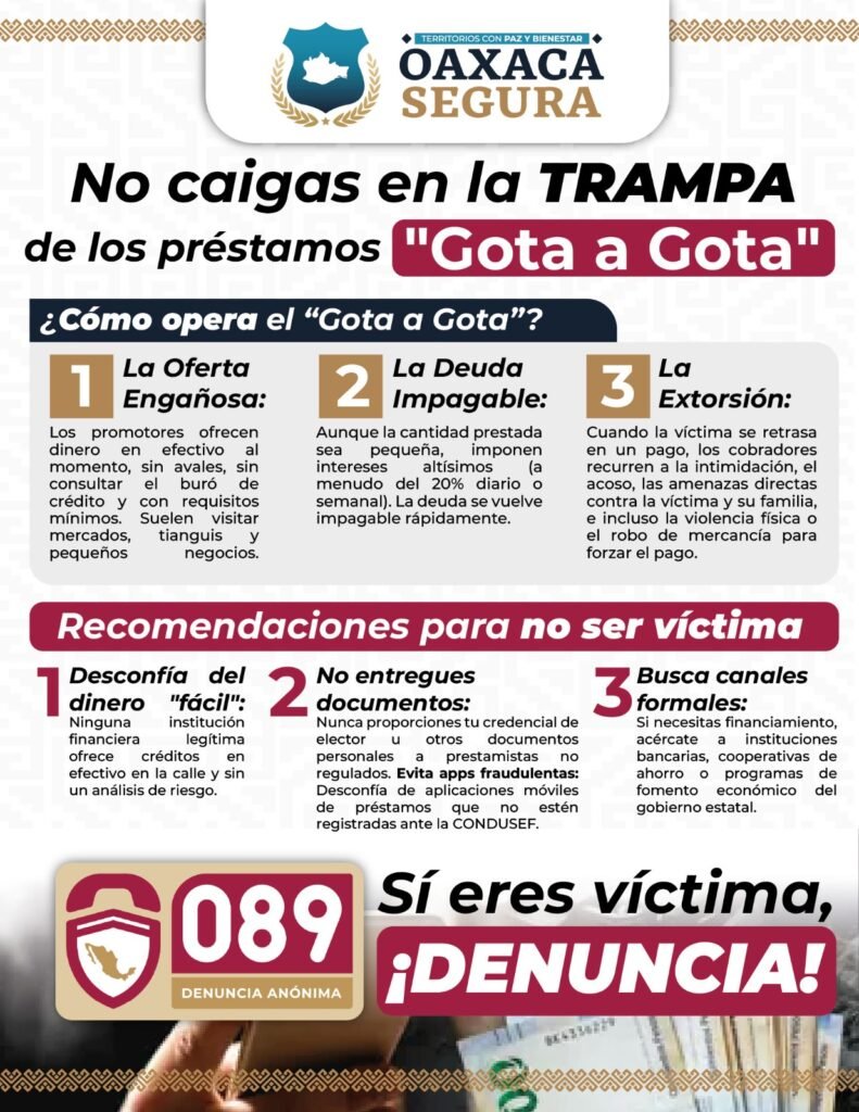 Oaxaca de Juárez, Oax.- Como parte del programa Oaxaca Segura, la Secretaría de Seguridad y Protección Ciudadana (SSPC) advirtió a la población sobre el esquema de fraude y extorsión “Gota a Gota”, una modalidad delictiva que se disfraza de préstamo fácil e inmediato, afectando la economía e integridad de las personas.